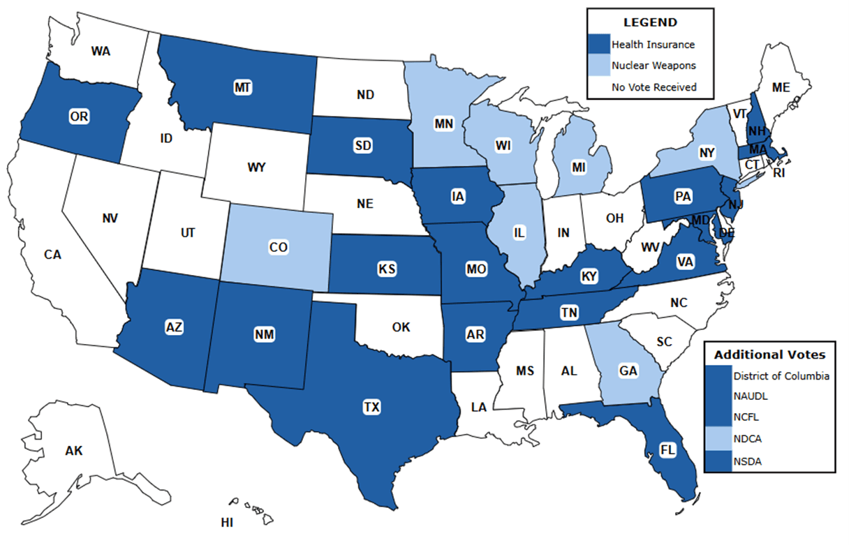 Three stages of voting were used to determine the winning topic. The first was held during the NFHS Policy Debate Topic Selection Meeting August 1-3, 2025, where 68 attendees from 21 states and multiple national organizations compiled five potential choices. In addition to Health Insurance and Nuclear Weapons, other options included “Carbon Pricing,” “Corporate Control” and “Energy.”